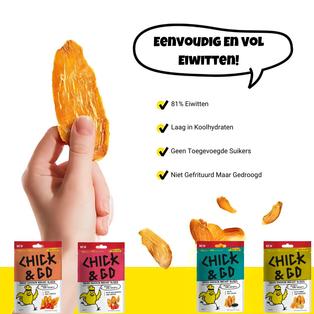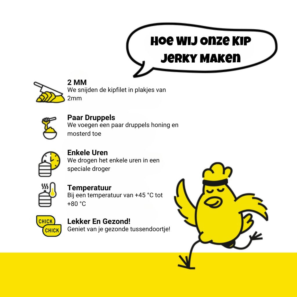 Onze kipjerky is bewust knapperig en stevig dat hoort bij het unieke karakter van gedroogd vlees. Maar we snappen dat de bite even wennen kan zijn! Gelukkig zijn smaken (en texturen 😉) persoonlijk. Toch bedankt voor het proberen van chick and go!